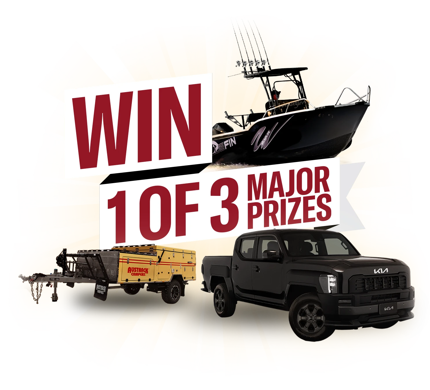 Each code gives you an entry into the Major Prize Draw for a Bluefin GNBC boat, an Austrack Savanna Camper trailer or a Kia Tasman SX Pick Up.
